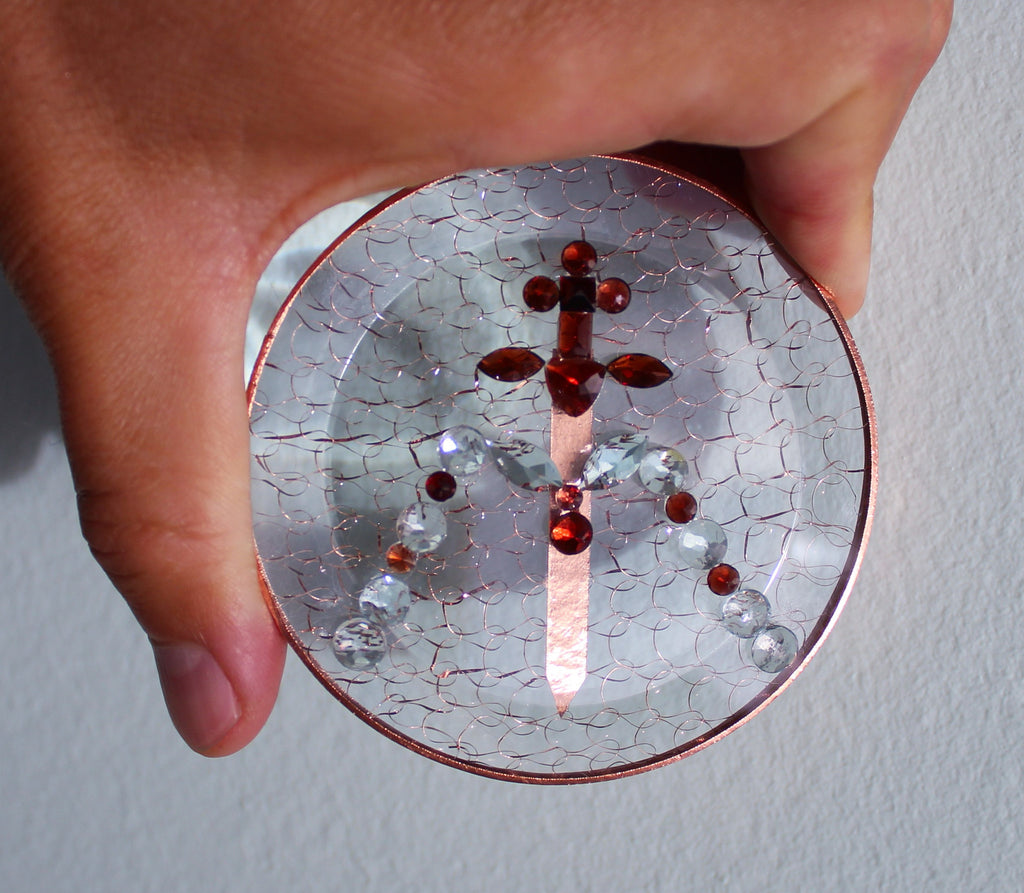It measures 3 inches in diameter. It is made of specialized quartz glass, cut to reflect the light in such a way as to amplify the power of the cosmic energies.