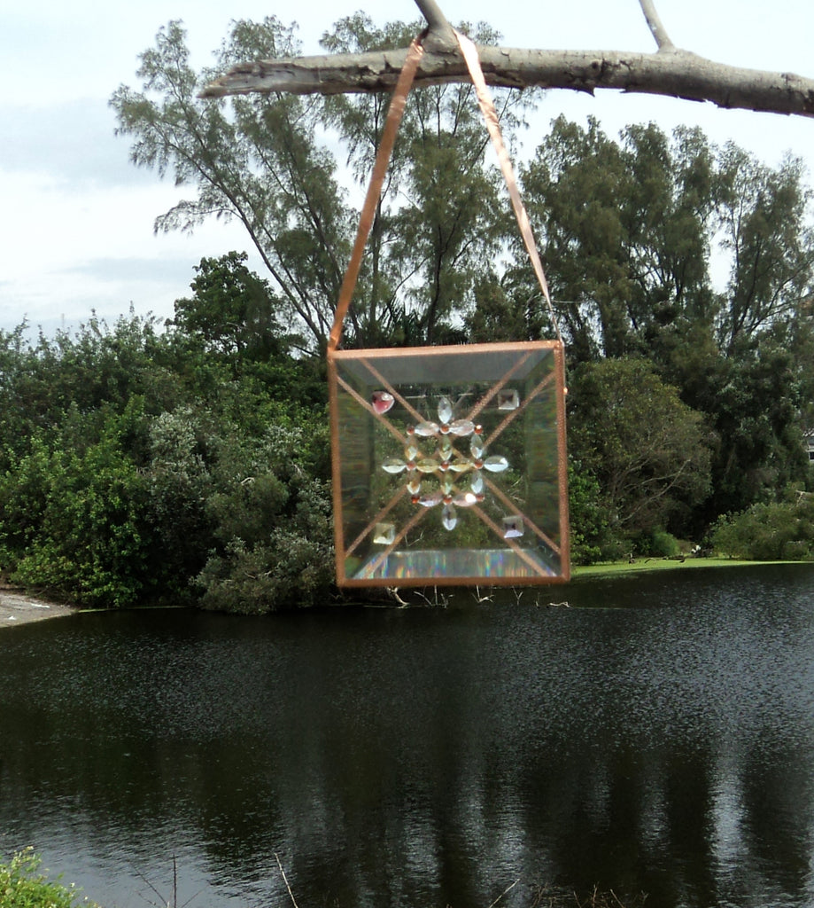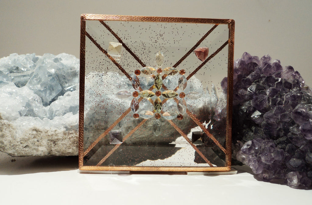 It measures 3 inches x 3 inches. It is made of specialized quartz glass, cut to reflect the light in such a way as to amplify the power of the cosmic energies.