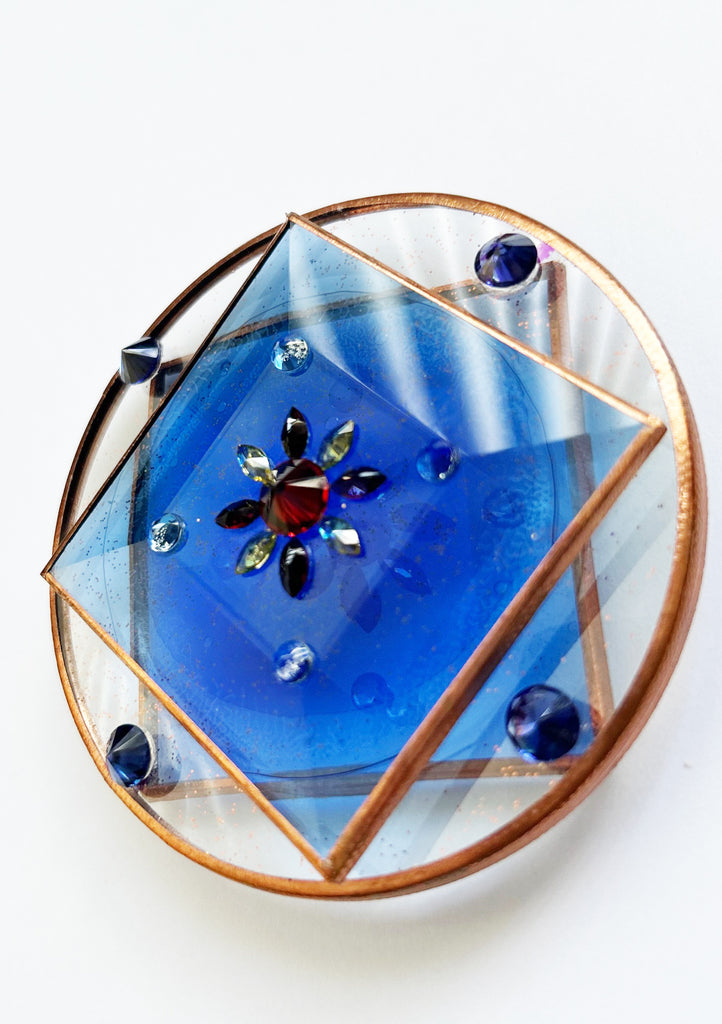 Hand-crafted in reverence and created through divine download, this piece merges layers of sacred geometry: a copper-anchored circle, a raised diamond square, and a radiant central blossom of crystals—each point carefully aligned and encoded.
